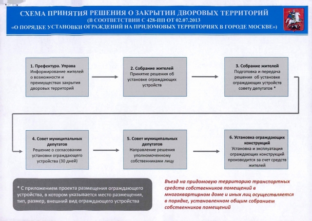 - В муниципальный совет депутатов подаются соответствующее заявление, протокол собрания жильцов-собственников и техническая документация, то есть проект ограждения. Совет принимает решение не дольше месяца (это отдельно законодательно оговорено) и о своем решении уведомляет того, кто подал заявление, не позже, чем через пять дней после вынесения вердикта.
