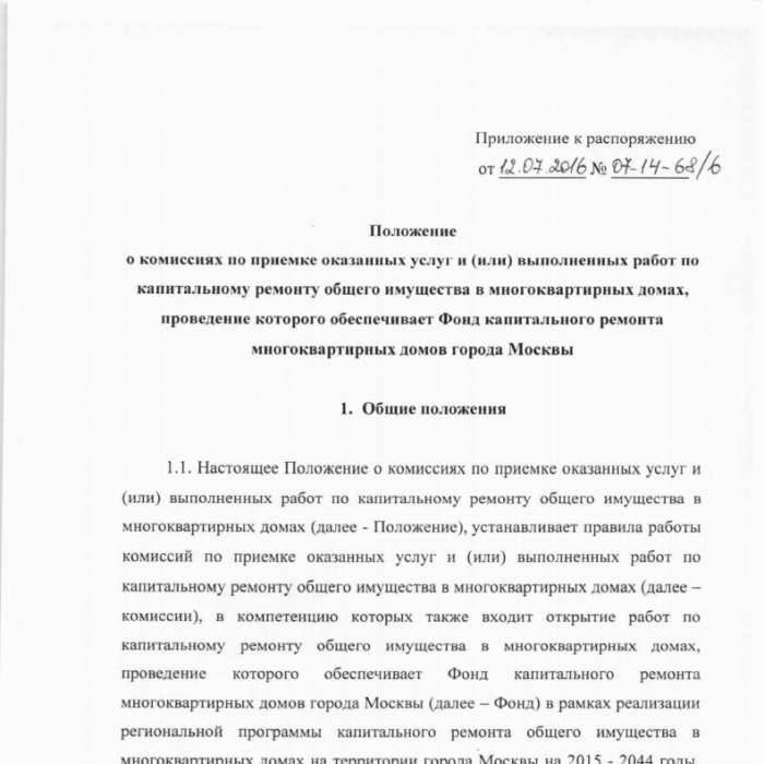 Положение о комиссиях по приемке оказанных услуг и (или) выполненных работ по капитальному ремонту общего имущества в многоквартирных домах, проведение которого обеспечивает Фонд капитального ремонта многоквартирных домов города Москвы