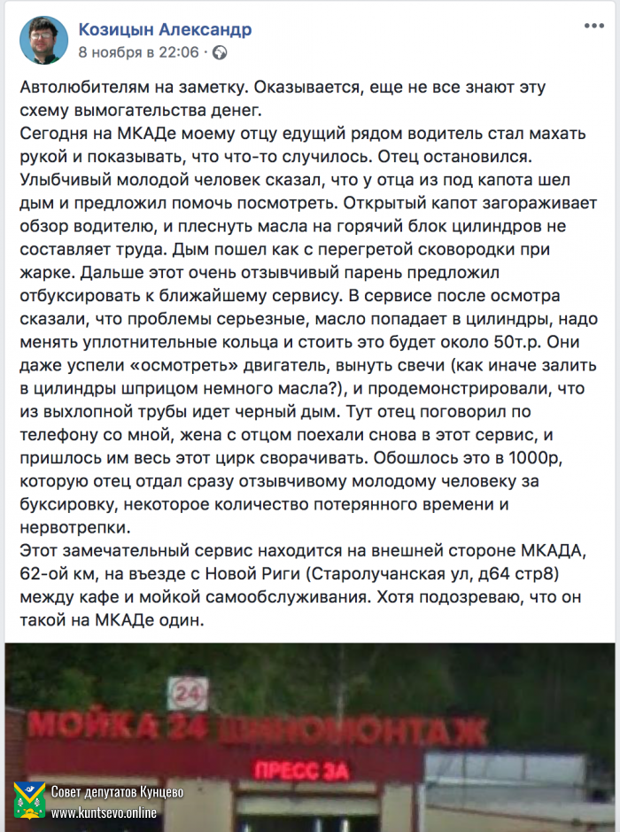 О мошеннических действиях с ремонтом автомобилей в Рублёво Реквизиты обращения Рег. номер: МОК-4/1-246 Ведомство \ организация: Начальнику отдела МВД по р-ну Кунцево Дата отправки: 20.06.2019 Статус ответа: Ответ получен Обращение: 2019-06-20-246-o-moshennicheskih-deistvijah-s-remontom-avtomobilei-v-rublyovo-1.pdf | Скачать | 125 Кб Ответ: 028november.pdf | Скачать | 1 Мб проишествия 20.06.2019 10:28 2362 Алексеев Алексей 2 комментария RSS Написать комментарий Алексеев Алексей 12.11.2019 20:00 # ↓ Вот тут схожая www.facebook.com/photo.php?fbid=1464229277062076&set=a.888627561288920&type=3 Скриншот Ответить Алексеев Алексей 26.11.2019 19:37 # ↓ Ответить Ваше имя: E-mail для ответов: Загрузка...