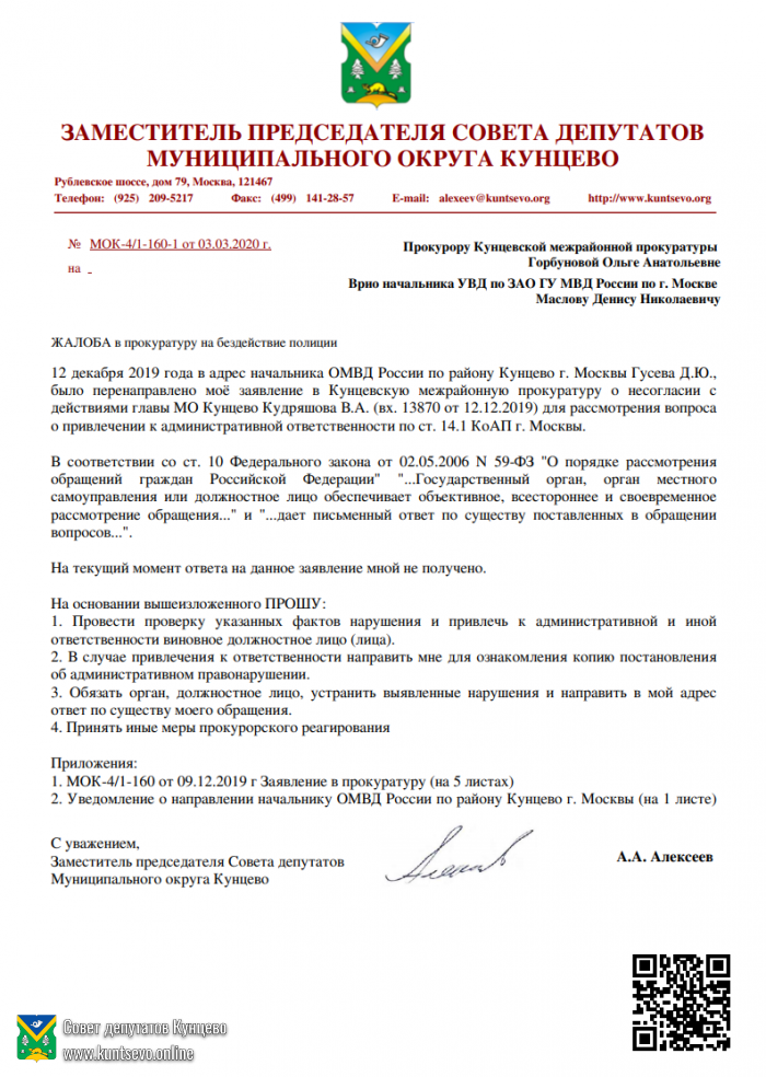 «Установлено, что при рассмотрении Вашего заявления сотрудниками Отдела Министерства внутренних Российской Федерации дел района Кунцево города Москвы допущены нарушения действующего законодательства, проводится служебная проверка, по результатам которой к виновным сотрудникам будут приняты меры дисциплинарного воздействия.»
