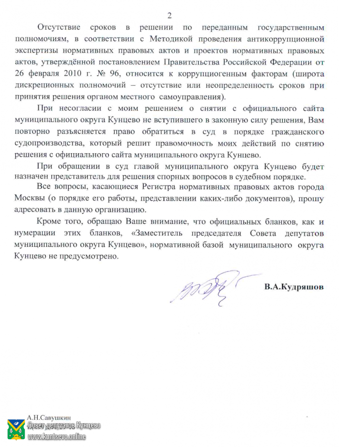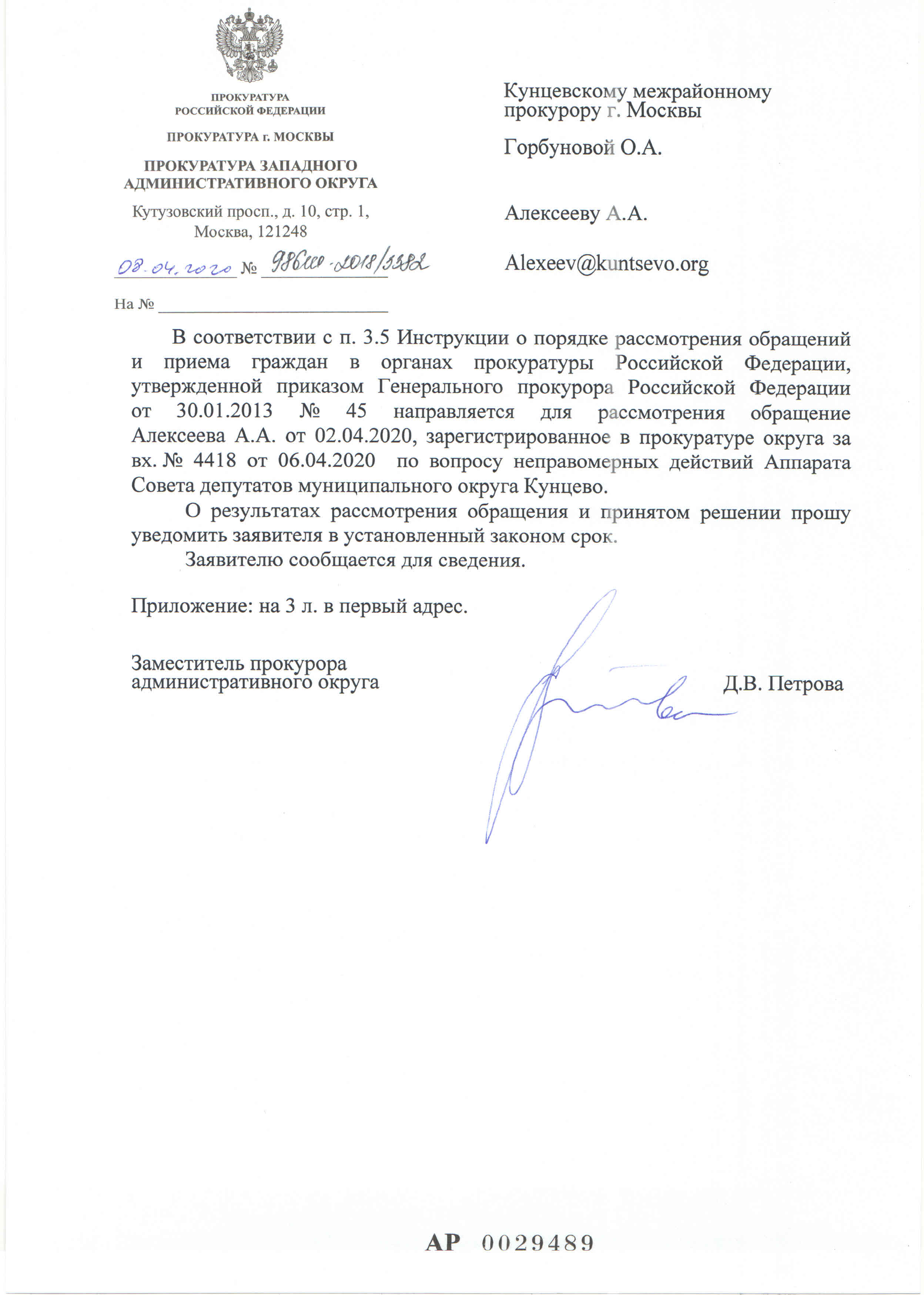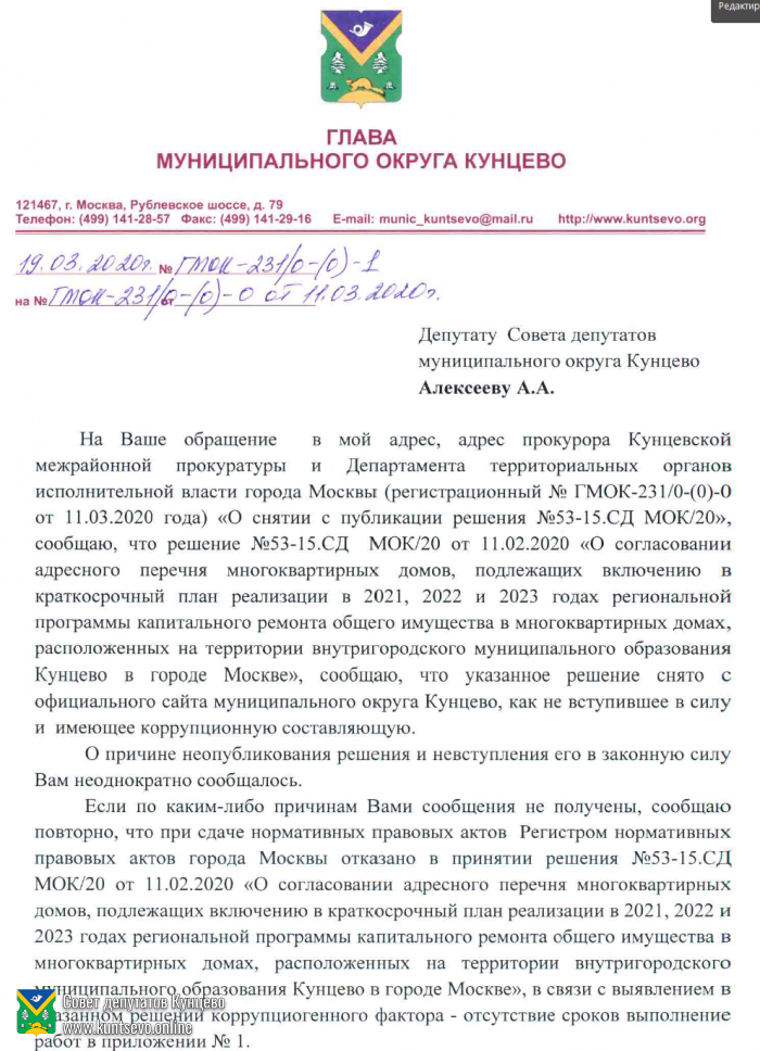 О снятии с публикации решения №53-15.СДМОК/20 Реквизиты обращения Рег. номер: МОК-4/1-207 Ведомство \ организация: Кунцевская межрайонная прокуратура Дата отправки: 11.03.2020 Статус ответа: Ожидание ответа Обращение: https://pdf.kuntsevo.online/static/5e68da7080587.pdf Приложение: ИконкаНазвание файлаРазмерСкачать 2020.04.02 Обжалование ответа прокуратуры ЗАО(629 КБ)Скачать 2020-04-08 Промежуточный ответ Прок. ЗАО - пересылка в Кунце...унцево(419.6 КБ)Скачать 2020.03.19 Отписка Кудряшова от 19.03.2020(541.8 КБ)Скачать 11.03.2020 15:32 1194 Алексеев Алексей 1 комментарий RSS Написать комментарий Алексеев Алексей 19.03.2020 21:22 # ↓ Кудряшов прислал очередную отписку Спойлер Ответить Ваше имя: E-mail для ответов: Загрузка...