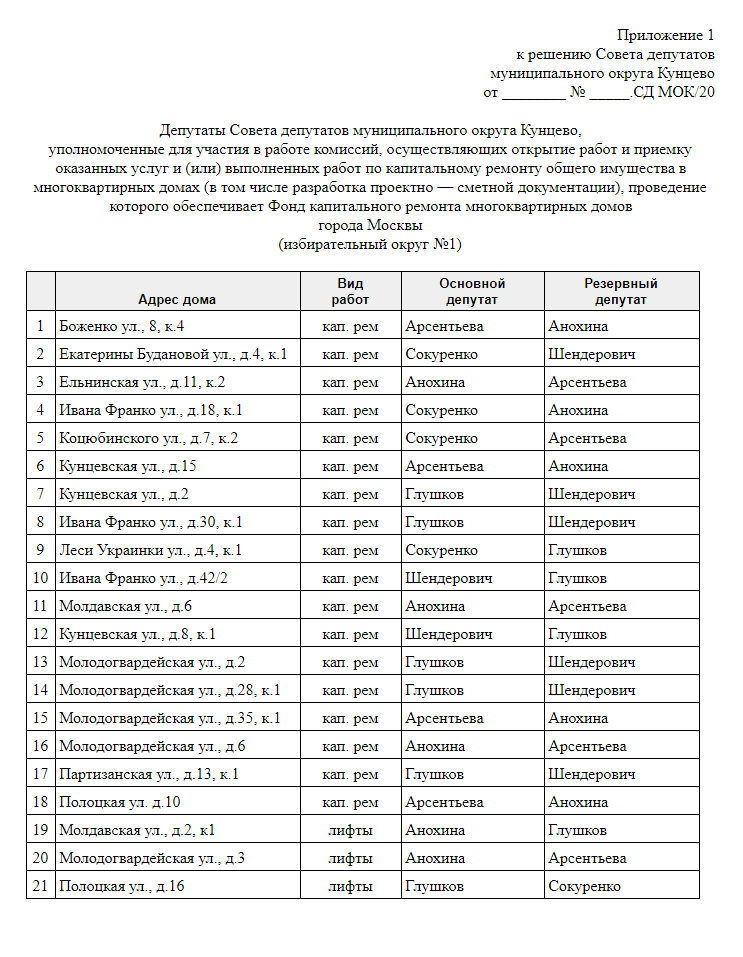 1. | Об участии депутатов Совета депутатов муниципального округа Кунцево в работе комиссий по капитальному ремонту общего имущества в многоквартирных домах в 2021 - 2023 годах. Информация депутатов А.А.Алексеева, Д.И.Шендеровича. | 15 мин. |