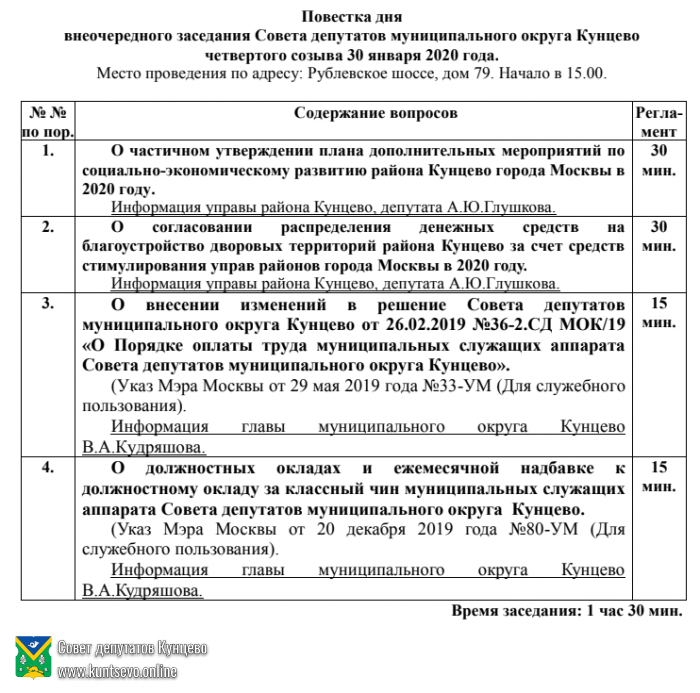 | 2 | О внесении изменений в решение Совета депутатов МО Кунцево от 26.02.2019 №36-2.СД МОК/19 «О Порядке оплаты труда муниципальных служащих аппарата Совета депутатов муниципального округа Кунцево»Информация главы муниципального округа Кунцево В.А.Кудряшова. | Проект | 15 минут | Не опубликовано |