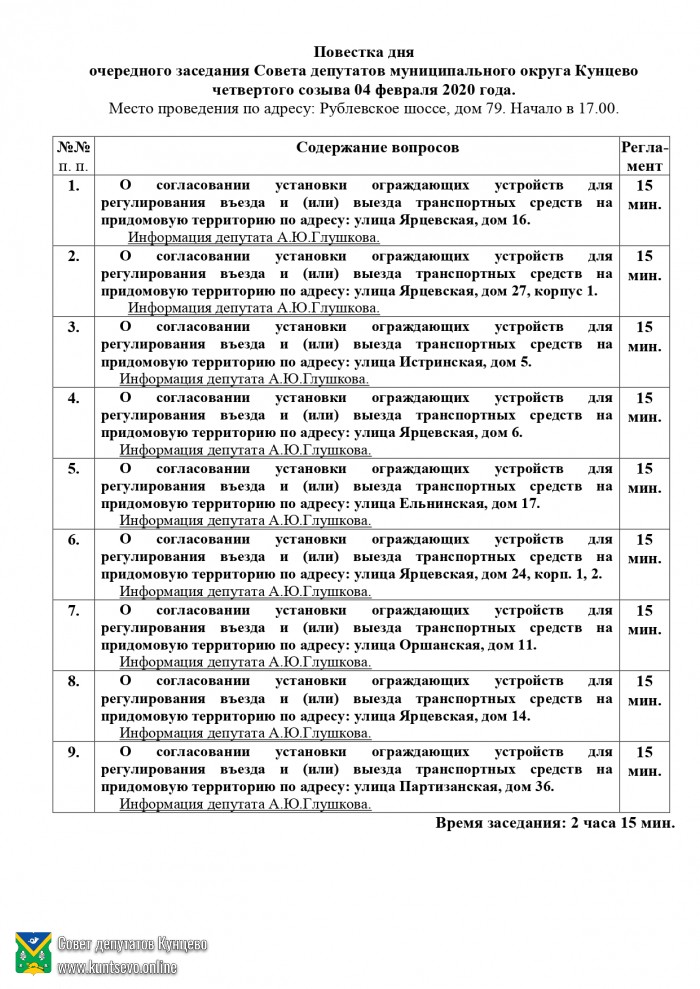 СД МОК-52 Заседание Совета депутатов Совет депутатов Кунцево Дата проведения: 04.02.2020 17:00 Тип заседания: Внеочередное Присутствовали: Анохина Н. Б.Арсентьева Г. В.Глушков А. Ю. Отсутствовали: Алексеев А. А.Барков Е. Н.Крашакова Т. В.Мальцева С. В.Сокуренко В. А.Тюркин В. В.Шендерович Д. И. Председательствующий: Кудряшов В.А. Статус: Не состоялось (Отсутствие кворума) Протокол заседания: Читать онлайн | Скачать | 76 Кб внеочередное 03.02.2020 23:12 1577 Алексеев Алексей № Наименование Статус принятия Скан решения Регл. Статус публикации 1 О согласовании установки ограждающих устройств для регулирования въезда и (или) выезда транспортных средств на придомовую территорию по адресу: улица Ярцевская, дом 14 Проект 20 минут Не опубликовано 2 О согласовании ограждающих устройств, регулирующих въезд и/или выезд на придомовую территорию многоквартирного дома по адресу: ул. Ельнинская, дом 17 Информация депутата Д.И.Шендеровича Проект 15 минут Не опубликовано 3 О согласовании ограждающих устройств, регулирующих въезд и/или выезд на придомовую территорию многоквартирного дома по адресу: ул. Ельнинская, д. 17 Информация Д.И.Шендеровича. Проект 20 минут Не опубликовано 4 О согласовании ограждающих устройств, регулирующих въезд и/или выезд на придомовую территорию многоквартирного дома по адресу: ул. Ярцевская, дом 24, корпуса 1, 2 Информация депутата Д.И.Шендеровича Проект 15 минут Не опубликовано 5 О согласовании ограждающих устройств, регулирующих въезд и/или выезд на придомовую территорию многоквартирного дома по адресу: ул. Ярцевская, дом 16 Информация депутата Д.И.Шендеровича Проект 15 минут Не опубликовано 6 О согласовании ограждающих устройств, регулирующих въезд и/или выезд на придомовую территорию многоквартирного дома по адресу: ул. Ярцевская, дом 27, корпус 1 Проект 15 минут Не опубликовано Комментарии RSS Написать комментарий Нет комментариев. Ваш будет первым! Ваше имя: E-mail для ответов: Загрузка...