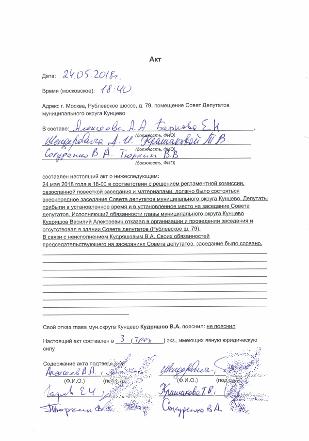 24 мая 2018г. депутаты Крашакова Т., Алексеев А., Тюркин В., Шендерович Д., Барков Е., Сокуренко В. прибыли на заседание Совета к 17 часам.