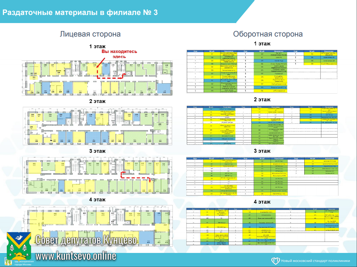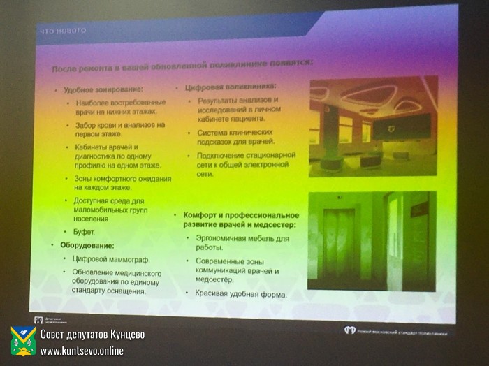 Присутствующим была представлена красочная презентация с визуализацией будущего прекрасного преображения поликлиники и схемами-графиками перемещения врачей и пациентов на период ремонта в остающийся филиал №3. В докладе и на картинках план выглядит продуманным и лёгким в реализации.
