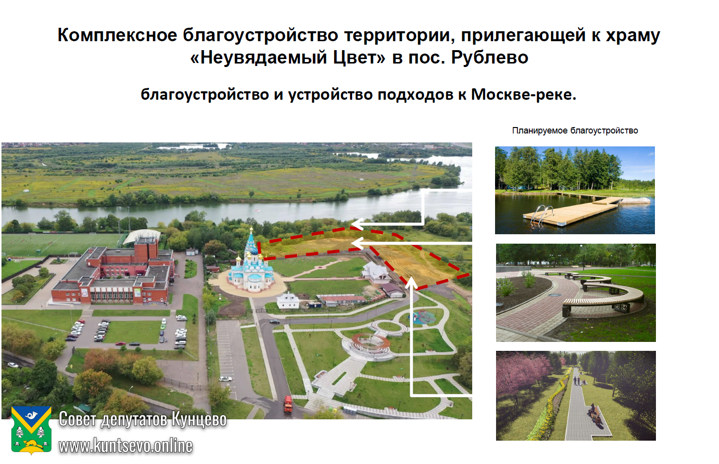 В рамках реализации благоустройства в 2020 году по программе «Мой район» планируется благоустройство территории парка, прилегающего к храму Иконы Божьей Матери «Неувядаемый цвет» в поселке Рублево (входит в Кунцево).