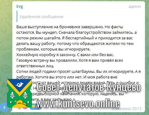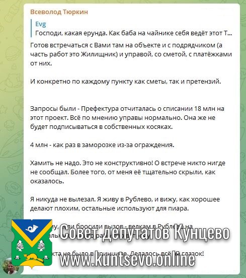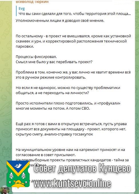 Депутат Всеволод Тюркин попытался донести куда большее количество проблем с этой площадкой. Почти два десятка замечаний. Также пригласил на реальную очную рабочую встречу с реальными депутатами и жителями. Но Евгений Попов заблокировал его, посчитав, что депутаты у него пиарятся перед выборами и ничего не делают.