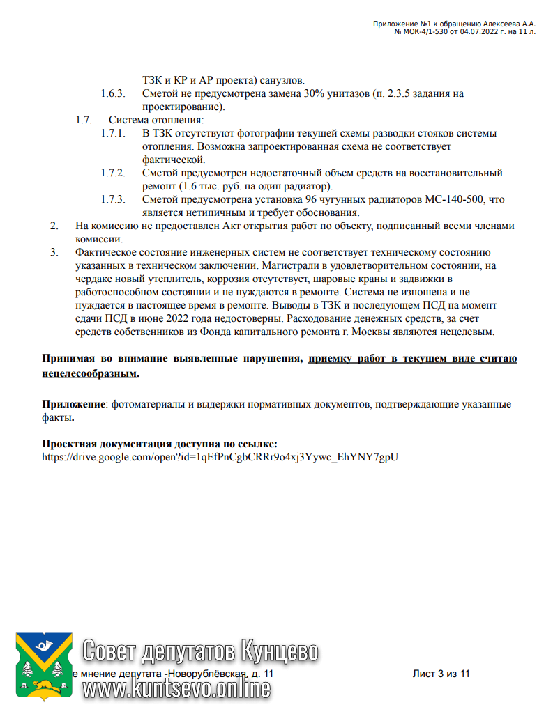Направил свое несогласие с приёмкой проектной документации на Новорублёвской 11