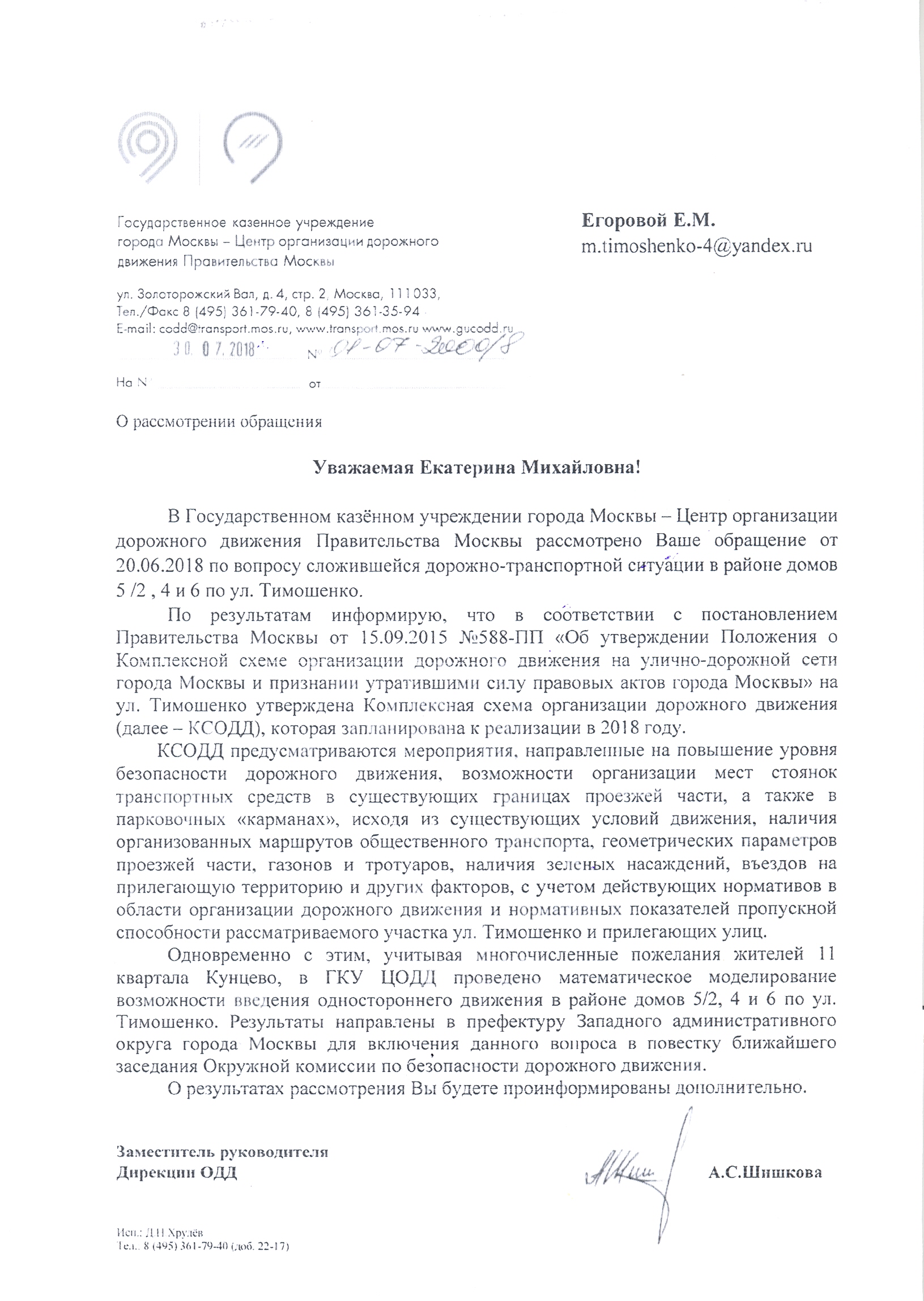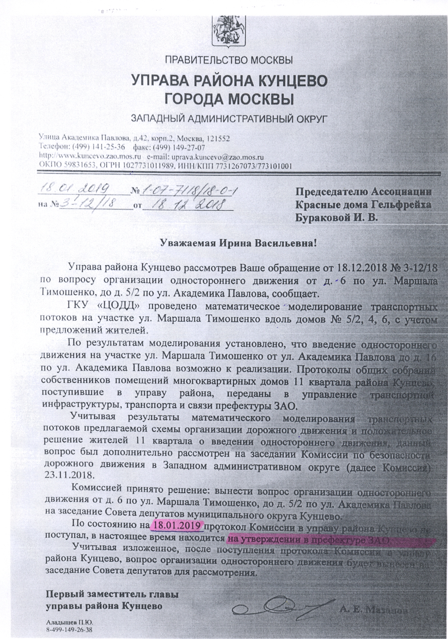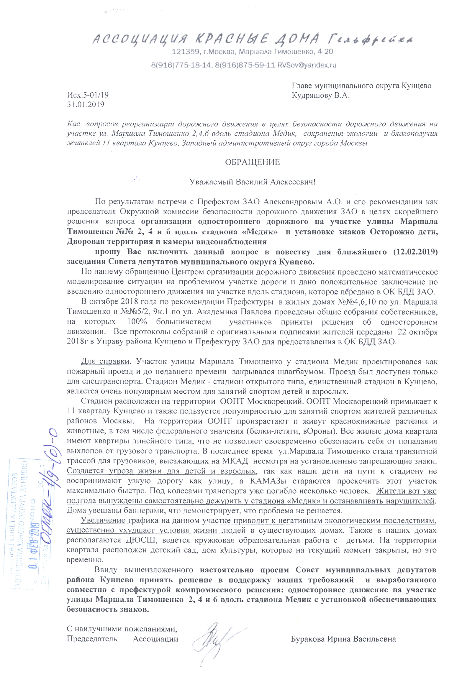 Об обращении в Комиссию по безопасности дорожного движения в ЗАО г. Москвы по вопросу организации одностороннего движения в квартале 11 района Кунцево по улице Маршала Тимошенко 2,4,6