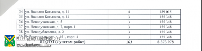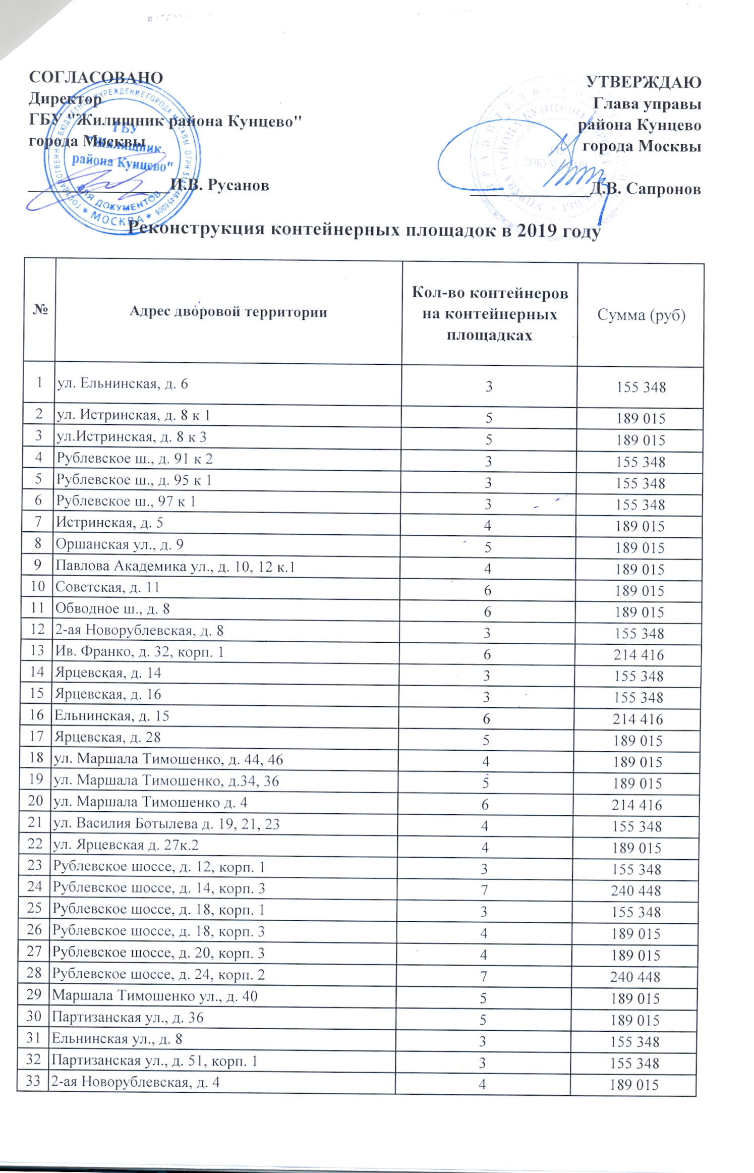 - Согласовать распределения денежных средств на реконструкцию контейнерных площадок района Кунцево по 39 адресам за счет средств стимулирования управ районов города Москвы на сумму 8 373 978 (Восемь миллионов триста семьдесят три тысячи девятьсот семьдесят восемь) рублей (приложение):