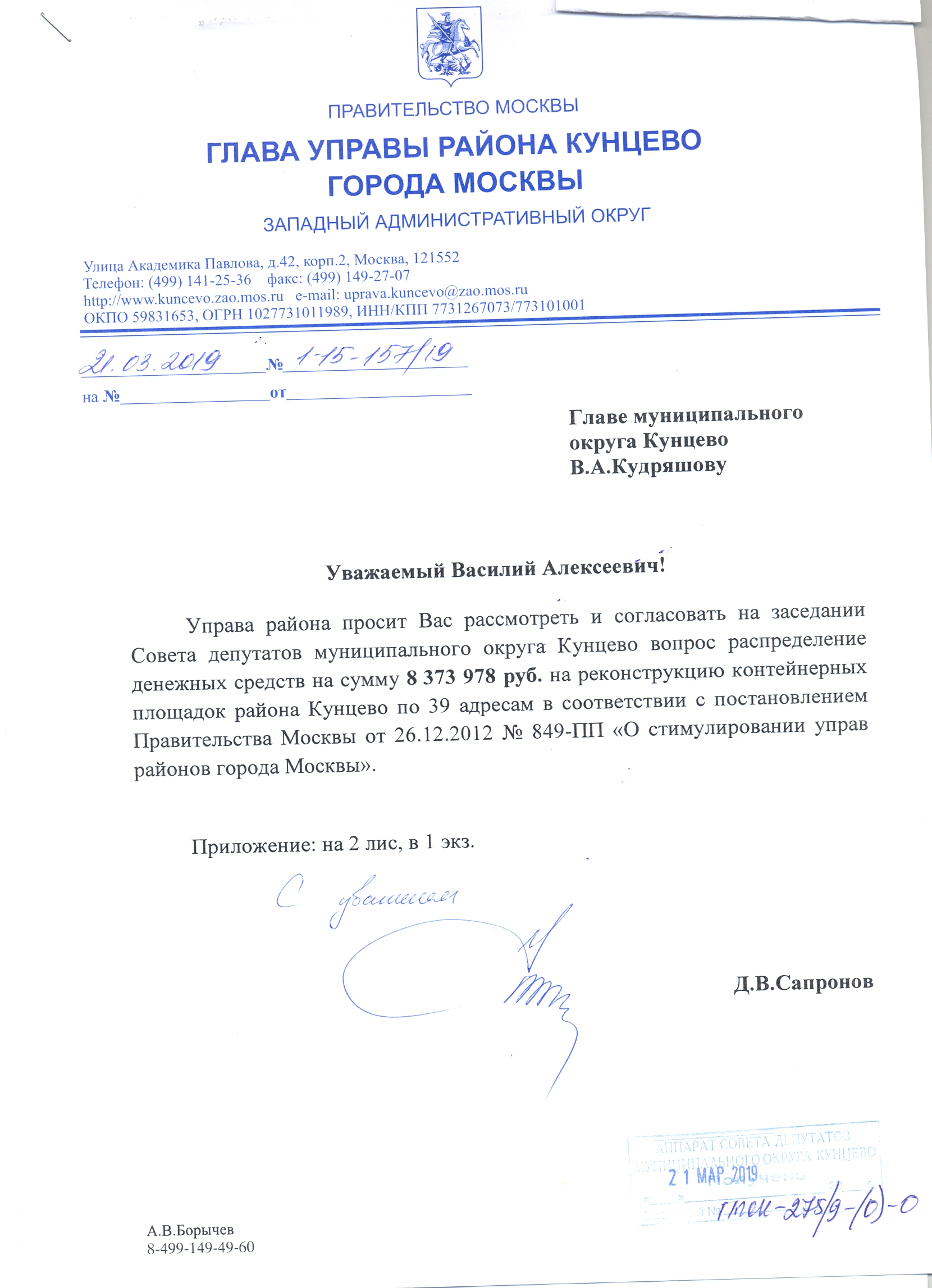 В соответствии с постановлением Правительства Москвы от 26 декабря 2012 года №849-ПП «О стимулировании управ районов города Москвы» и на основании обращения главы управы района Кунцево города Москвы от 21.03.2019 №1-15-157/19, Совет депутатов муниципального округа Кунцево решил: