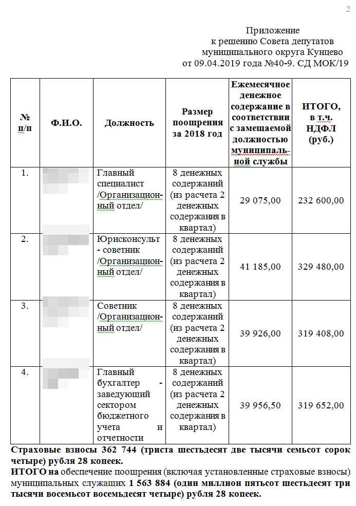 - 1.За добросовестное исполнение должностных обязанностей, успешное выполнение особо важных и сложных заданий, по итогам четырёх кварталов 2018 года, выделить на обеспечение поощрения (включая установленные страховые взносы) муниципальных служащих аппарата Совета депутатов муниципального округа Кунцево денежные средства из свободного остатка местного бюджета муниципального округа Кунцево, образовавшегося на 01 января 2019 года, согласно Приложению.