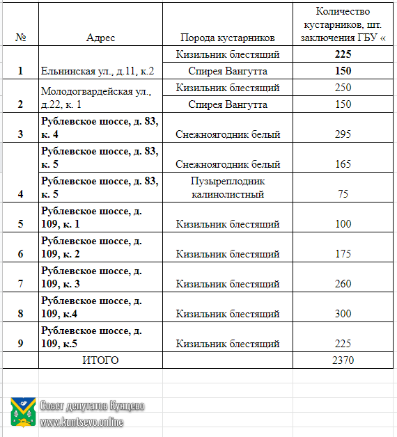 О согласовании адресного перечня объектов озеленения 3-й категории района Кунцево города Москвы, на которых будет производиться посадка кустарников, по результатам опросов на проекте «Активный гражданин», в осенний период 2019 года.