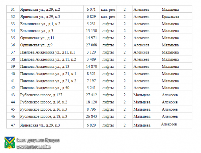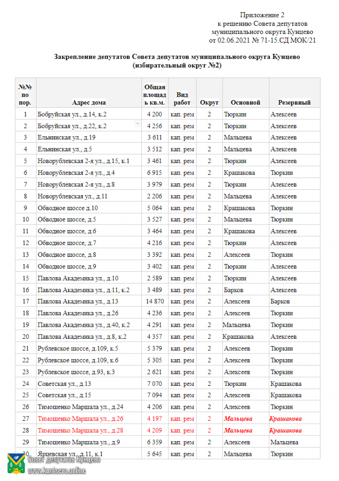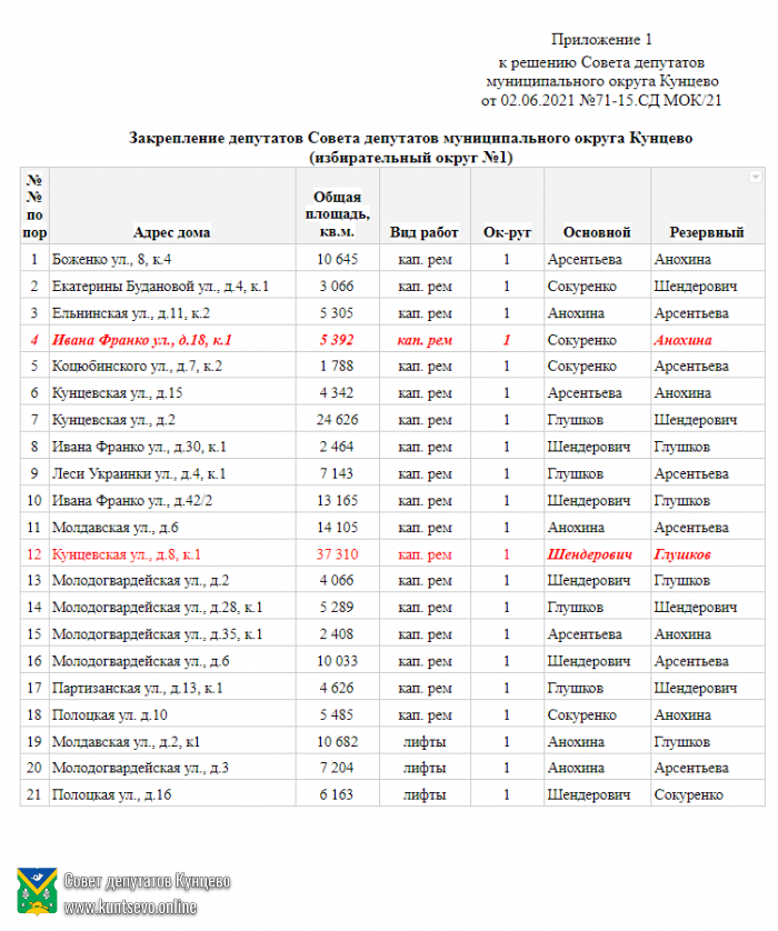 - Определить закрепление депутатов Совета депутатов муниципального округа Кунцево для участия в работе комиссий, осуществляющих открытие работ и приемку оказанных услуг и (или) выполненных работ по капитальному ремонту инженерных систем, конструктивных элементов и замене лифтового оборудования (приложения