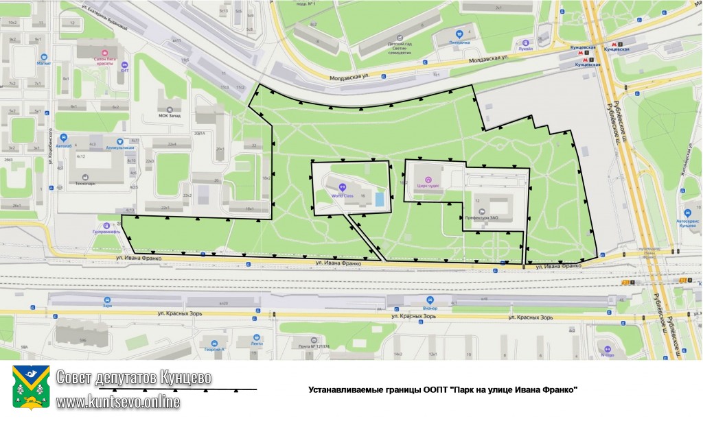 - Внести в уполномоченный орган исполнительной власти города Москвы – Департамент природопользования и охраны окружающей среды – предложение (Приложение 1) об установлении на территории муниципального округа Кунцево особо охраняемой природной территории регионального значения в категории памятника природы г. Москвы «Парк на ул. Ивана Франко» в границах: на севере – пути Московского метрополитена Арбатско-Покровской линии, на юге – улица Ивана Франко, на востоке – Рублёвское шоссе, на западе – улица Коцюбинского (примерная площадь – 155000 кв.м).