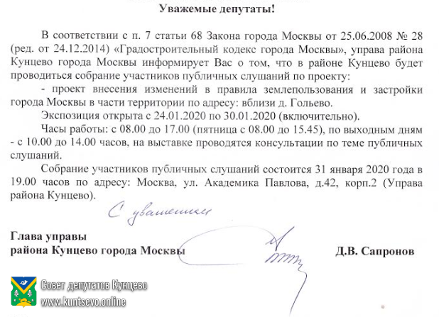 Оповещение о проведении публичных слушаний в районе Кунцево